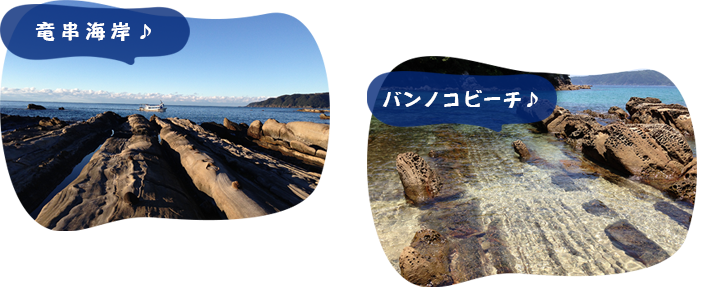 第3紀層砂岩を波と風がえぐってできた大竹小竹を上空から見ると、まるで龍が串刺しになったかのような形。そんな岩礁風景から人々はこの土地を「竜串」と呼ぶ。
